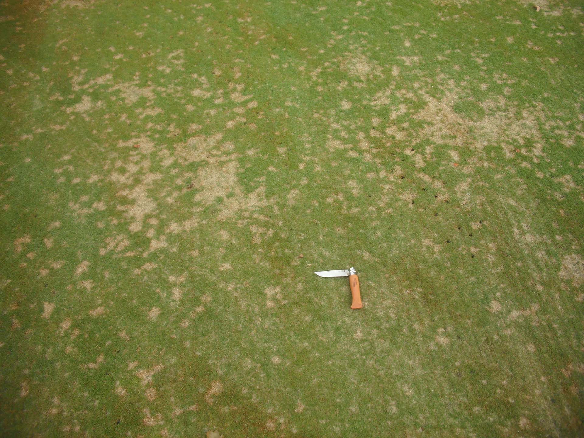Le premier rapport concernant dollar spot date de 19271. A l’époque, John Monteith le décrit alors comme le « petit brown patch » en raison des lésions foliaires (voir figure 2) observées similaires aux « brûlures transversales » du brown patch mais une formation de tâches circulaires ne dépassant pas la taille d’une pièce d’un dollar sur les gazons coupés à ras (voir figure 3). Le terme « petit brown patch » fut remplacé par en 1932 par « dollar spot » pour éviter les confusions avec le « large brown patch » causé par Rhizoctonia solani2(voir figure 1).