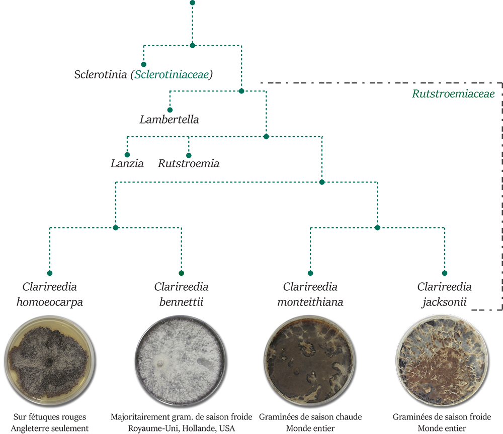 - A travers le temps, de nombreux chercheurs ont émis l’hypothèse de la non appartenance du pathogène au genre Sclerotinia. C’est seulement aujourd’hui à l’aide des nouvelles techniques moléculaires basées sur l’analyse phylogénétique que les scientifiques ont pu rattacher le champignon pathogène à un nouveau genre : Clarireedia.