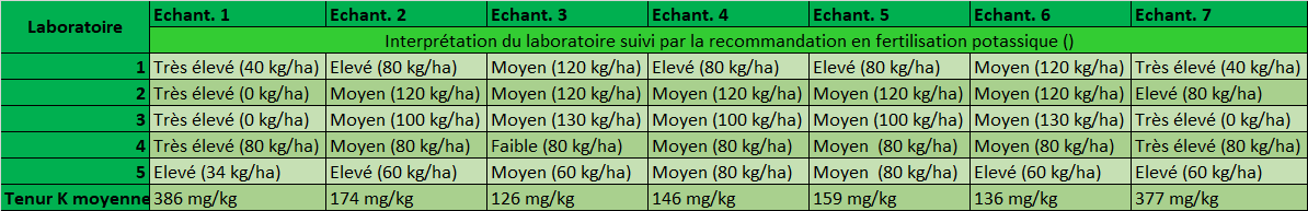 D’abord, les interprétations sur les valeurs mesurées sont à peu près comparables (faible, moyen, élevé). Ensuite, les recommandations sur les applications d’engrais correspondantes sont plutôt surprenantes car au final moyennement dépendantes des valeurs mesurées. Par exemple, l’échantillon 3 dont la teneur était considérée comme « faible » nécessite des applications comprises entre 60 et 130 kg K/ha. L’échantillon 6, dont la teneur était considérée comme « moyenne » nécessite également des apports compris entre 60 et 130 kg. Dernier exemple : la teneur de l’échantillon 5 est considérée comme « moyenne » pour la plupart des laboratoires et élevée pour un laboratoire qui conseille tout de même un apport de 83 kg K/ha.