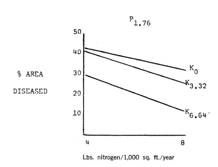 Pour la fusariose froide, les deux auteurs déclarent que l’incidence de la maladie est moindre pour des quantités d’azote annuelles comprises entre 300 et 600 kg N/ha et de potassium à 390 kg K/ha soit un ratio N/K compris entre 0.5 et 1,52. Selon eux, l’incidence élevée de la fusariose en automne est liée aux faibles teneurs foliaires en potassium à cette époque de l’année. Les auteurs recommandent alors des plans annuels avec un équilibre de type 3-1-2 (N-P-K) et des quantités de l’ordre de 350-120-400 kg/ha d’azote, phosphore et potassium respectivement pour une résistance et une qualité optimales du gazon2.