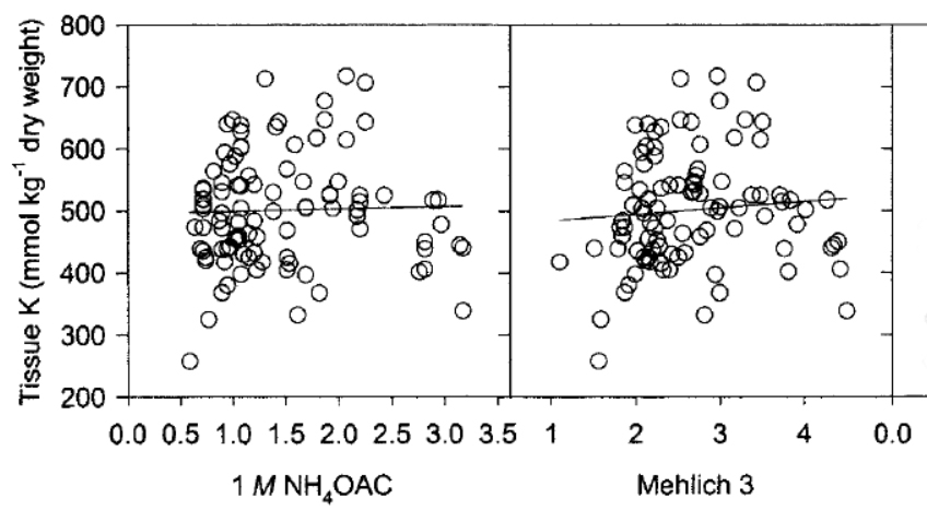 Or, si cette hypothèse est parfois observée24, les résultats de plusieurs études réalisées sur pâturin des prés, chiendent et agrostide stolonifère ne vont pas dans le sens de cette observation. Ils indiquent parfois l’absence d’augmentation de la concentration en potassium dans les tissus foliaires suite à une augmentation de la fertilisation potassique, malgré des teneurs en potassium échangeable considérées comme faibles dans le sol par les laboratoires d’analyse21,23,32,35,36.